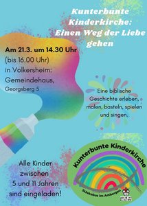 Ab sofort laden wir einmal im Monat ein zur Kunterbunten Kinderkirche nach Volkersheim. Am letzten Samstag im Monat beginnen wir um 14.30 Uhr in der Kirche mit dem Erleben einer biblischen Geschichte. Im Anschluss geht es ins Gemeindehaus, wo die Kinder kreativ werden können: malen, basteln, spielen. Wir hoffen, dass sich nicht nur Kinder aus Volkersheim, sondern auch aus den anderen Orten unserer Kirchengemeinde auf den Weg machen!
