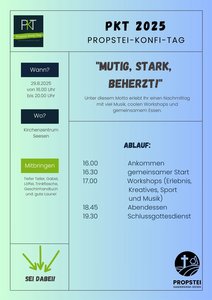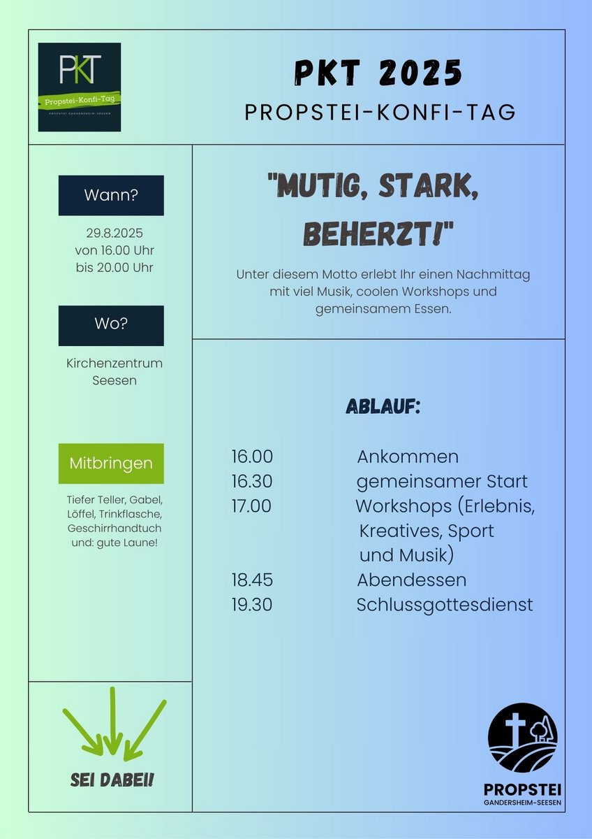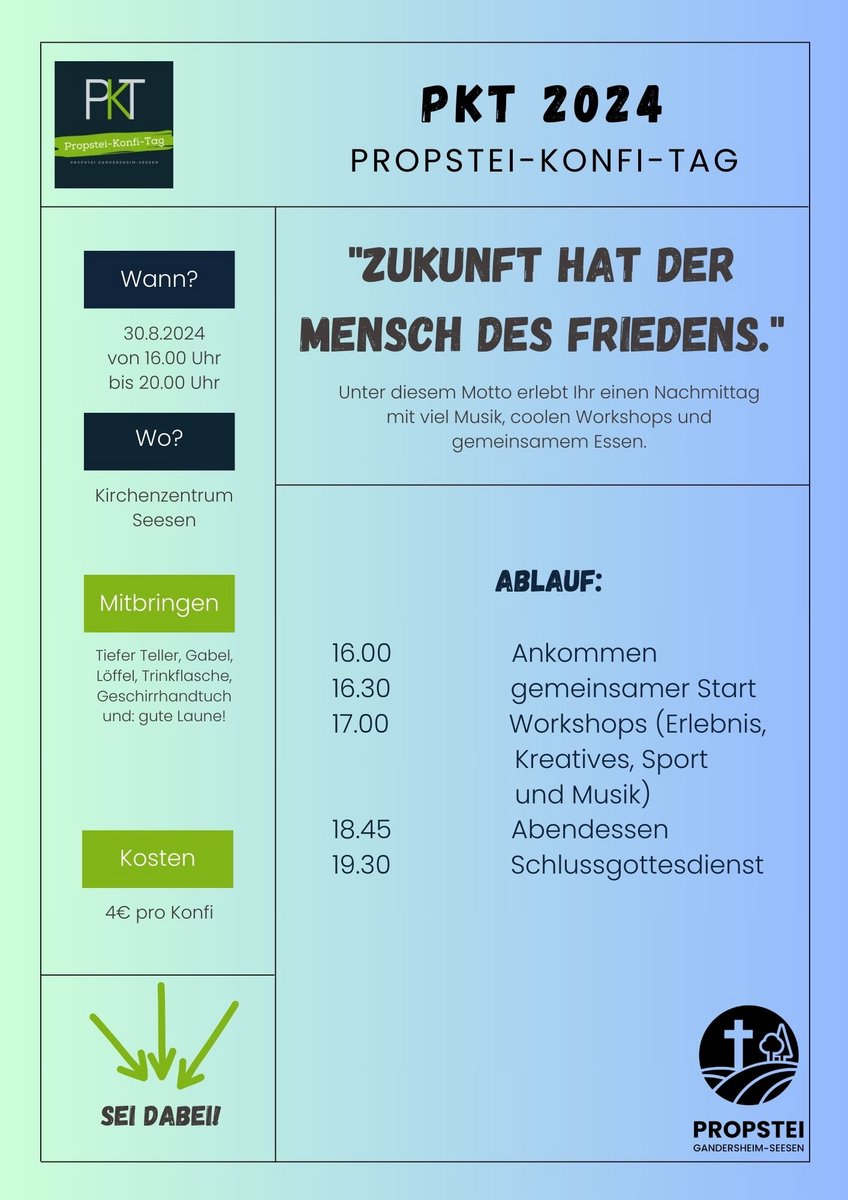 Einmal im Jahr findet der Propsteikonfitag (PKT) in und um das Kirchenzentrum in Seesen statt. Durch das Angebot unterschiedlicher Workshops (erlebnispädagogisch, sportlich, künstlerisch, darstellerisch, kreativ) sollen die Konfis Gemeinschaft über die eigene Kirchengemeinde hinaus erleben und das Angebot der Evangelischen Jugend kennenlernen, um so (auch) motiviert zu werden, über die Konfizeit hinaus an Angeboten der Evangelischen Jugend teilzunehmen. Wir beenden den Nachmittag mit einem gemeinsamen warmen Essen und anschließendem Schlussgottesdienst.